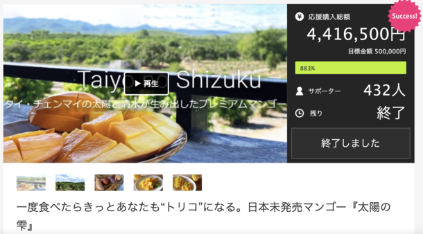 日本人の金子さんがタイに渡り、30年の歳月をかけて作り上げた金子農園のプレミアムマンゴーが、応援購入サービスMakuakeにて880%達成し、432名の方から応援購入を頂きました。