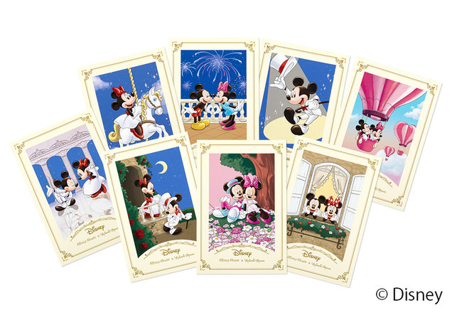 さらにうれしいお楽しみも!すべての箱に、記念のポストカードがはいっています。いろんな場面でデートを楽しむミッキーマウスとミニーマウスを描いた、全8種類のデザイン。お部屋に飾るのはもちろん、スイーツと一緒に写真に撮っても絵になる雰囲気です。ランダムに2点セットされていますので、どのカードに出会えるかお楽しみに!