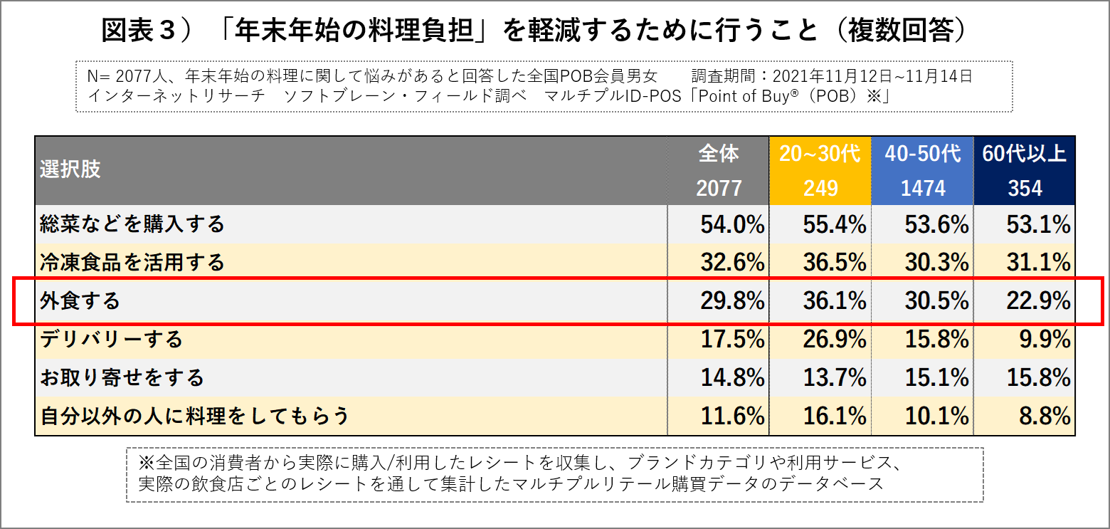 ・「年末年始の料理負担を軽減するために行うこと」を尋ねると、「総菜などを購入する(54.0%)」が半数を超え、「冷凍食品を活用する(32.6%)」が続き、「デリバリーする(17.5%)」よりも、「外食する(29.8%)」が大きく上回る。新規感染者数が最低水準で推移していることが理由として考えられる。