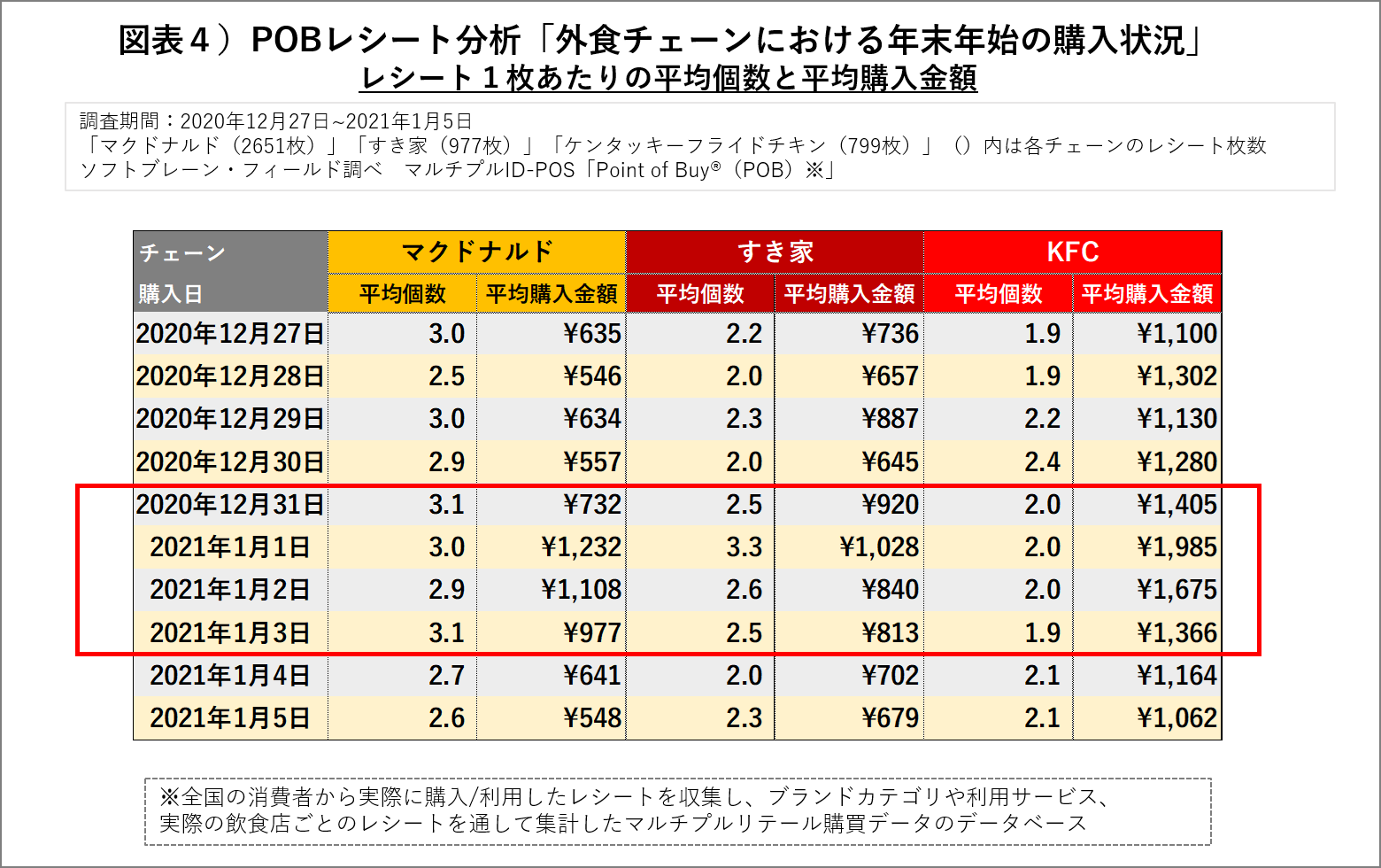 ・その他、昨年の年末年始<2020年12月27日~2021年1月5日>にPOB会員が利用した「マクドナルト」「すき家」「ケンタッキーフライドチキン」のレシートから、購入状況を分析。