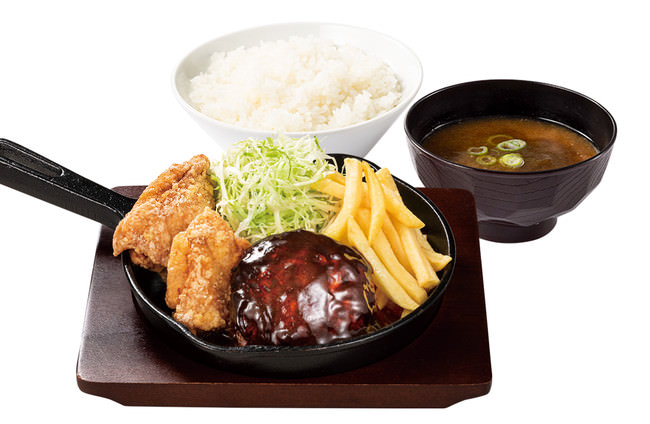牛と豚の旨味をギュッと閉じ込めた肉厚なハンバーグを期間限定メニューのにんにくからあげと合盛りにした冬のごちそう定食「ハンバーグとにんにくからあげ定食」が新登場。熱々に仕上げたデミグラスハンバーグにポテトフライを添えて、お子さまから大人まで楽しめる一品です。