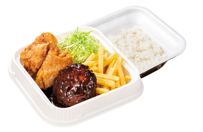 (ハンバーグ、にんにくからあげ2個、ポテトフライ、千切りキャベツ、ご飯)
