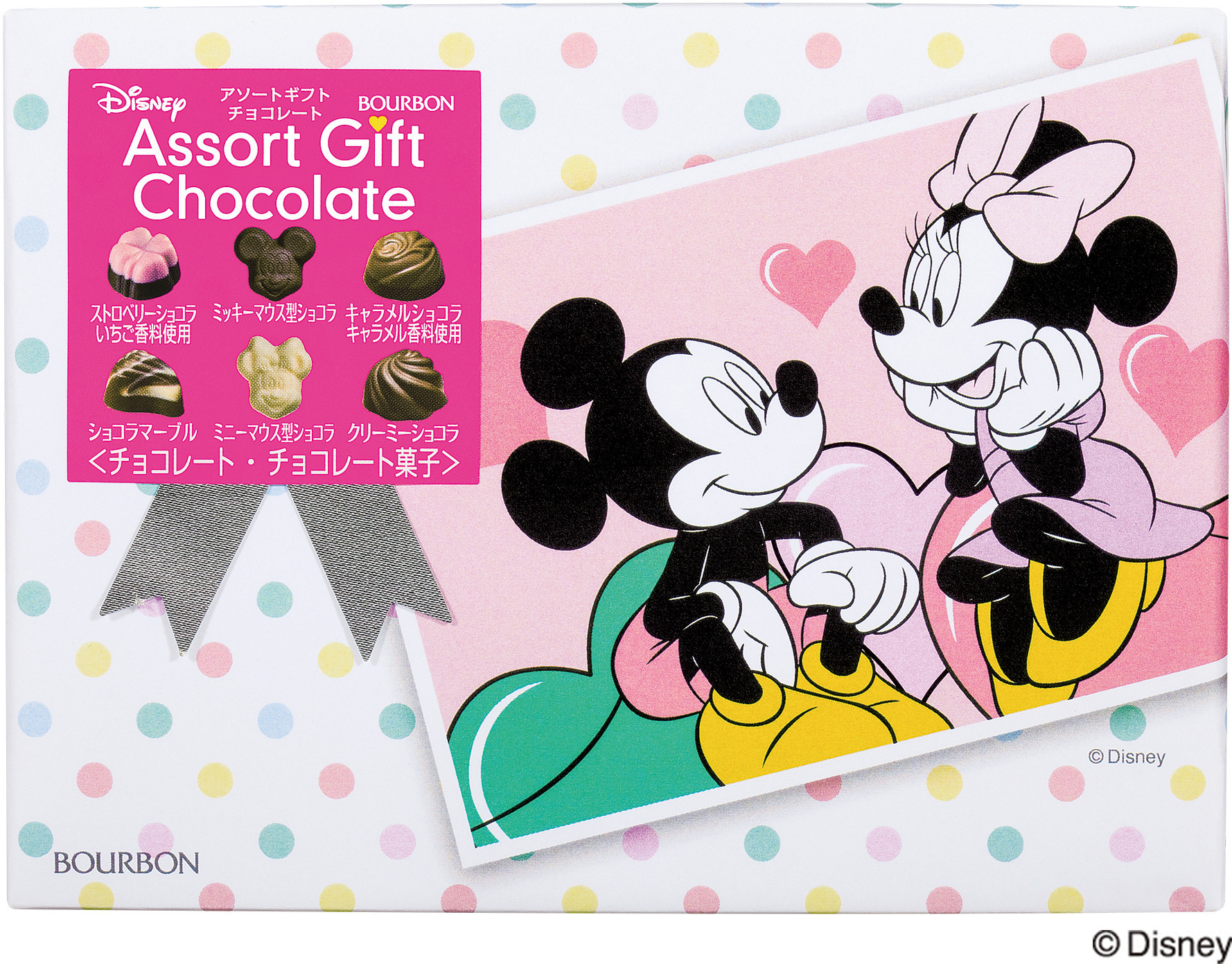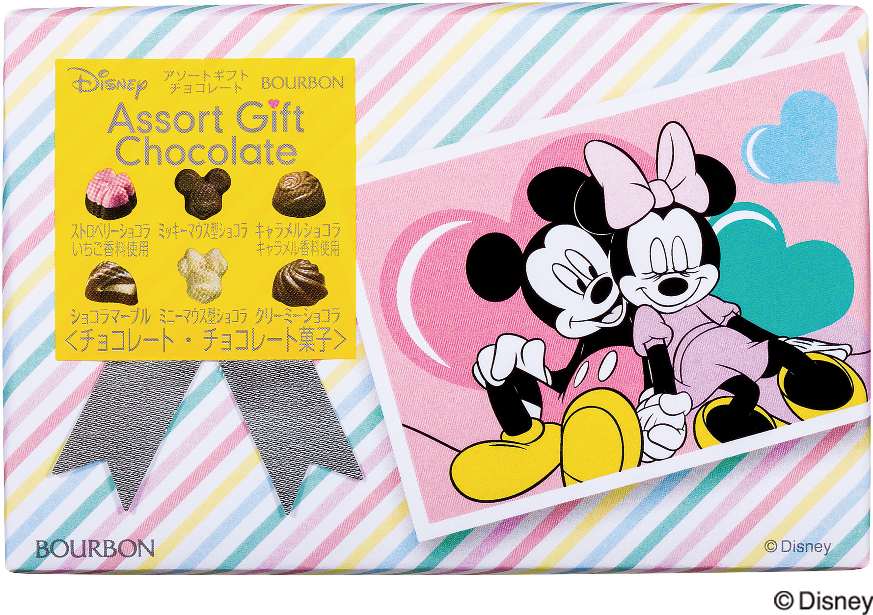 6種類のチョコレートを詰め合わせたバラエティ感のある商品です。ミッキーマウスとミニーマウスの顔を型どったチョコレートを入れたほか、ミッキーマウスとミニーマウスのシンプルで可愛らしいパッケージデザインとしました。そのまま贈ることのできるラッピングギフトです。