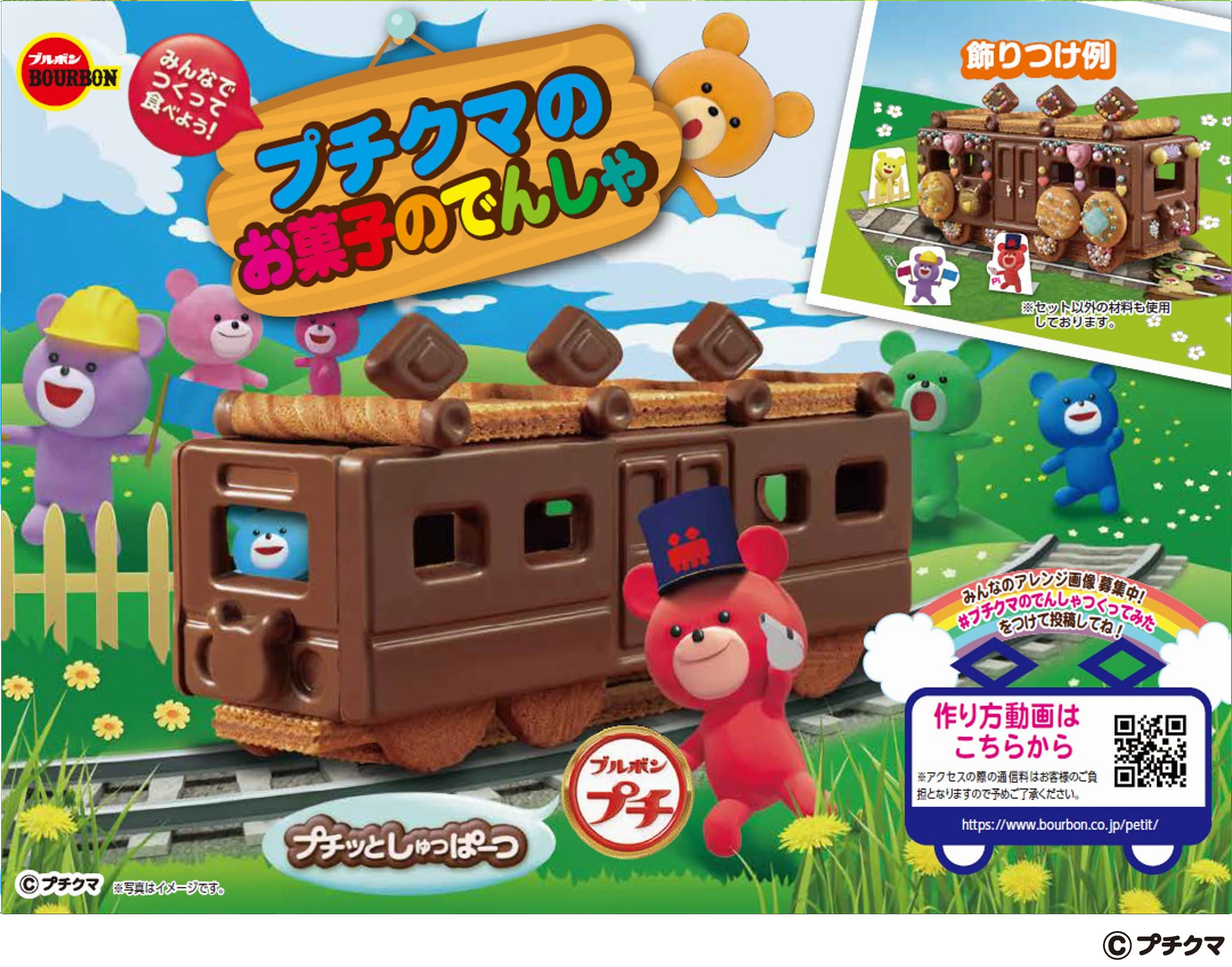ビスケットやウエハース、チョコレートなどでかわいいお菓子の“でんしゃ”を作ることができるセットです。パッケージの側面に切り取って遊ぶことのできるプチクマをデザインしました。