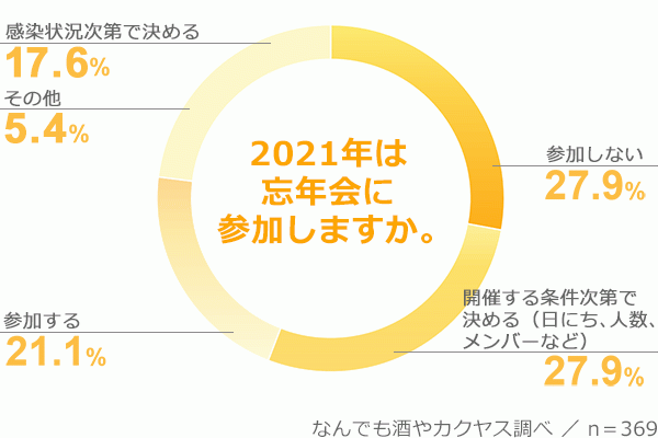 12月に入ると、にわかに気になるのが忘年会。2020年はコロナ禍で控えた人も少なくなさそうですが、果たして2021年はどうなのでしょうか。そこでカクラボ調査隊では、カクヤスメールマガジンに登録しているユーザーを対象に、忘年会に対する意識調査を実施しました。