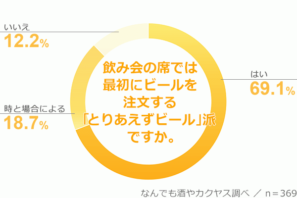 ところで、忘年会に限らず、飲み会の席でよく聞かれるのが「とりあえずビール」という言葉です。実際、どのくらいの人がそう言って最初にビールを注文するのかを調査してみたところ、7割近くの人が「とりあえずビール」派(以下、“とりビー派”)であることがわかりました。「時と場合による」という条件付きの人も加えると、なんと約9割が“とりビー派”という結果でした。