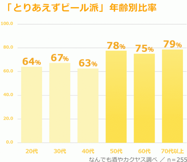 世代別でみると、興味深いことに50代を境に“とりビー派”の比率は分かれます。20代から40代までは60%台、50代から70代以上は70%台でした。“とりビー”率が最も低いのは40代で63%、逆に最も高いのは70代以上で79%に上ります。