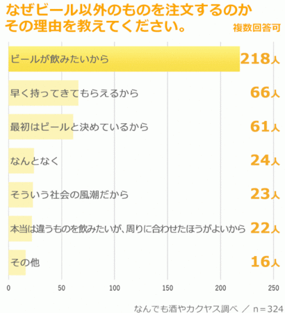 ちなみに、“とりビー派”ではない人になぜビール以外のものを注文するのか、その理由を聞いてみたところ、「好きなものを飲みたいから」が最も多く、次が「ビールが飲めないから、苦手だから」でした。