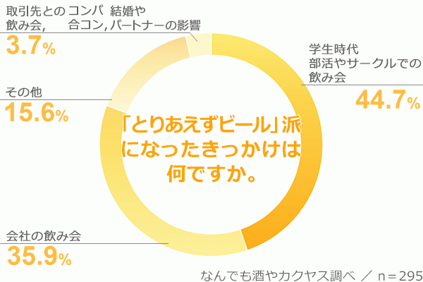 それにしても、“とりビー派”になったきっかけは何なのでしょうか。“とりビー派”を自認する人たちに聞いてみたところ、最も多かったのが「学生時代、部活やサークルでの飲み会」でした。学生時代といえば、初めてお酒を飲む人も多いはず。そこでの経験が身に付いて、つい「とりあえずビール」と言ってしまうのでしょうか。