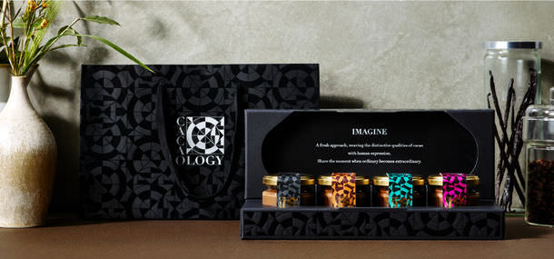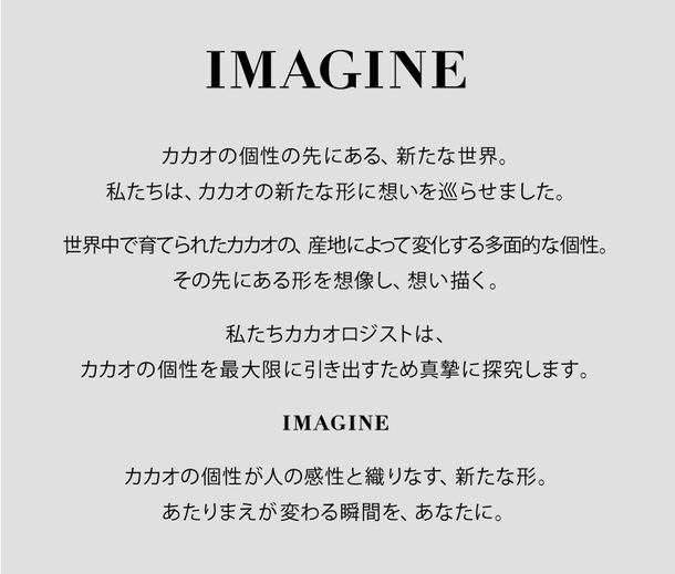 カカオ豆の個性を最大限引き出すためカカオをロジカルに捉え、真摯に探究し、想像力と技術でその魅力を表現するブランドとして、コンセプト「IMAGINE」を開発。ブランドコンセプトは、ブランドで一番重要な考えであり、あらゆる活動における判断基準です。デザインにおいてもコンセプトを軸にトータルデザインを行っています。