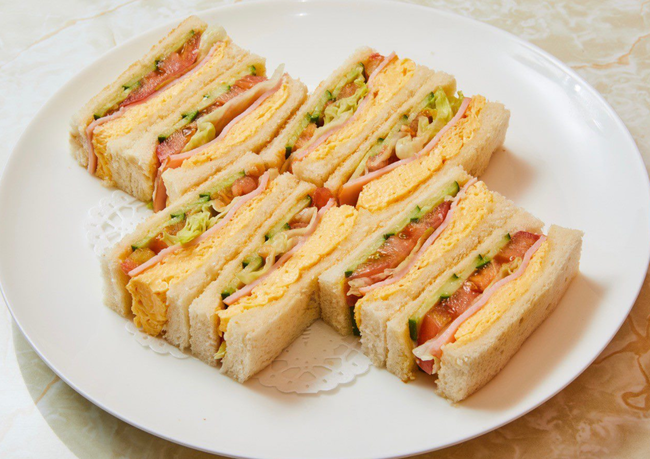 フレッシュなトマトとみずみずしいきゅうり、アクセントのハムと、丁寧に焼いた卵焼きを全部挟んだ贅沢なサンドゥイッチ。