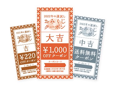 福袋にはもれなくおみくじクーポンがついてきます。1,000円OFF大吉クーポン、送料無料中吉クーポン、220円OFF吉クーポンのいずれかが当たります。新年最初の運試し、お楽しみに!