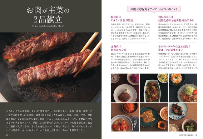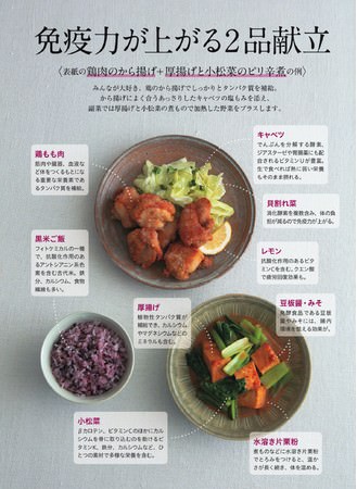 本書では効率よく体を強くするために、免疫力を高める食材をピックアップ。それらを組み合わせて主菜と副菜、主食と副菜の2品献立を30組み提案しています。表紙のから揚げの献立のように、おいしくてみんなが大好きな定番おかずで免疫力アップのコツがわかるのが特徴です。