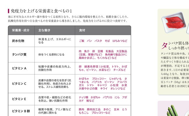 免疫力を上げるのに役立つ食材の一覧を掲載。体に不可欠なエネルギー源や体をつくる原料となり、さらに腸内環境を整えたり、粘膜を強くしたり、抗酸化作用を持つ主な食べものを栄養素から導き出しました。