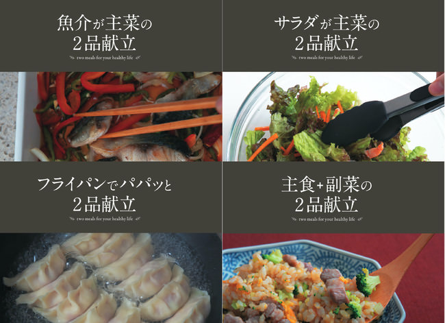 お肉・魚介・サラダが主菜の章と、フライパンひとつで2品献立が作れる章、ご飯や麺の主食と副菜を合わせた章など、バラエテイ豊かなレシピが満載の、1か月使いまわせる献立集。