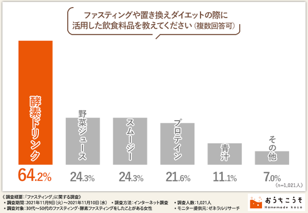 そこで、「ファスティングや置き換えダイエットの際に活用した飲食料品を教えてください」と質問してみたところ、『酵素ドリンク(64.2%)』が最も多く、次いで『野菜ジュース(24.3%)』『スムージー(24.3%)』と続きました。