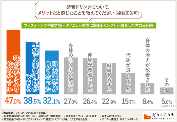 そこで、「酵素ドリンクについて、メリットだと感じたことを教えてください」と質問したところ、『味が気に入った、飲みやすい(47.0%)』が最も多く、次いで『手軽に栄養補助ができる(38.5%)』『肌の調子が良くなった(32.1%)』『身体のむくみが取れた(27.0%)』『便秘が解消された(26.4%)』と続きました。