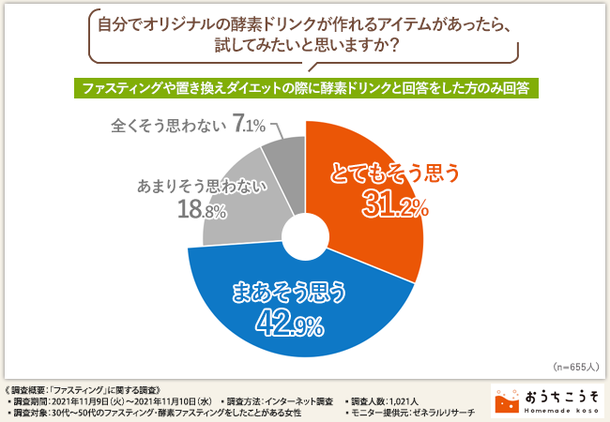 そこで、「自分でオリジナルの酵素ドリンクが作れるアイテムがあったら、試してみたいと思いますか?」と質問したところ、7割以上の方が『とてもそう思う(31.2%)』『まあそう思う(42.9%)』と回答しました。