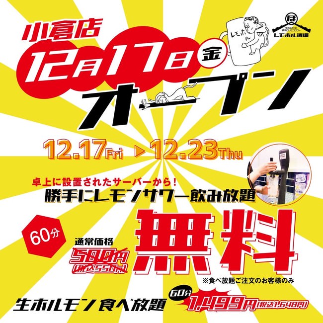 行列が絶えないコスパ最強No.1の【レモホル酒場】がついに小倉にも初上陸!!そのオープン記念に12月17日~12月23日まで、レモンサワー無料キャンペーンを実施致します★★