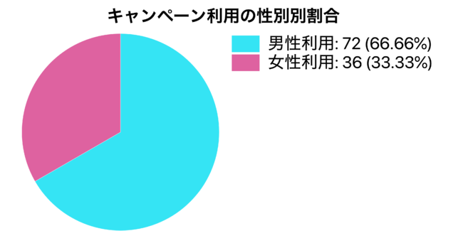 利用数を性別で分けた場合、男性からの利用が女性からの利用に比べ約2 倍ほど件数として計測。ただ、一般的に店内での異性へのお誘い、ナンパと言われる行動に関しては男性から女性へ行われるイメージが多くあったが、本企画を実施していく中で女性からのキャンペーン利用が意外な件数あった。店内でのお誘いは男性からのアクションがセオリーという先入観があったが、女性側からのアクションという見えていなかった部分が新たに見えた。
