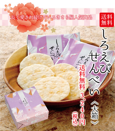 ささら屋の人気商品の「しろえびせんべい 大箱」や幅広い世代に喜ばれるバラエティおかきの「こきりこ 大箱」などを送料無料でお届けできます。