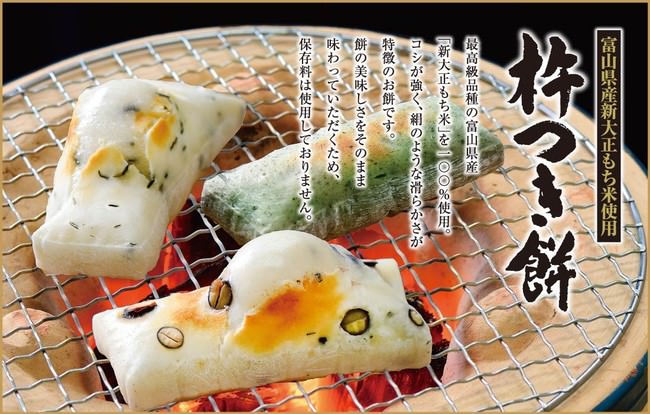 富山県産のもち米「新大正もち米」を100%使用し、こだわりの製法で作る「杵つき餅」。