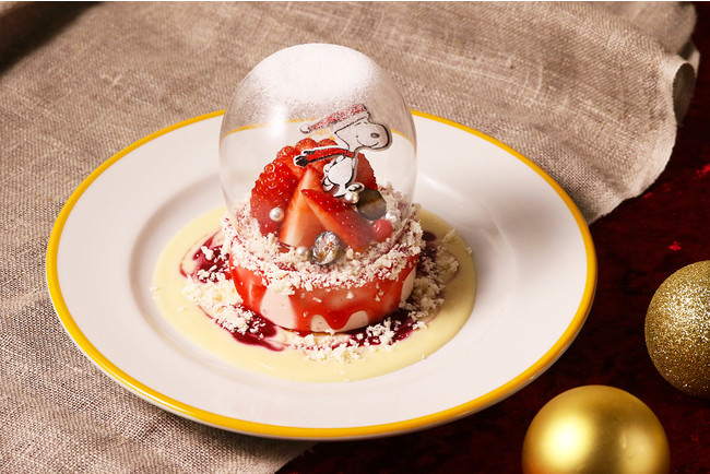 クリスマスデザインのスヌーピーのピックが飾られたベリームースは、まるでスノードームのような仕上がりに。