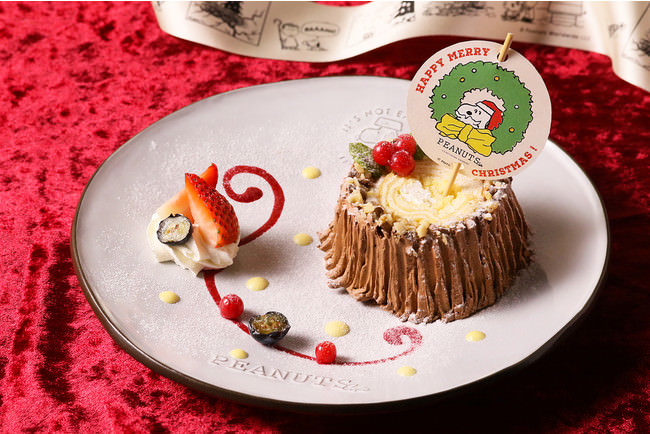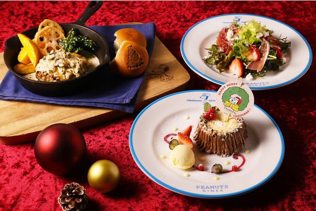 PEANUTS Cafe、DINERでお楽しみいただける今年のクリスマスは、ブランドごとに異なるメイン料理に、クリスマスカラーを彩るいちごのサラダ、スヌーピーのクリスマスピックが飾られたブッシュドノエルとドリンクがついた大満足セットをご用意いたしました。