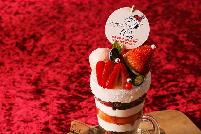クリスマスが待ち遠しいスヌーピーをイメージしたパフェ。いちごとチーズクリームでスヌーピーが被っている赤い帽子を、グラスの縁には砂糖で真っ白い雪の表現しました。