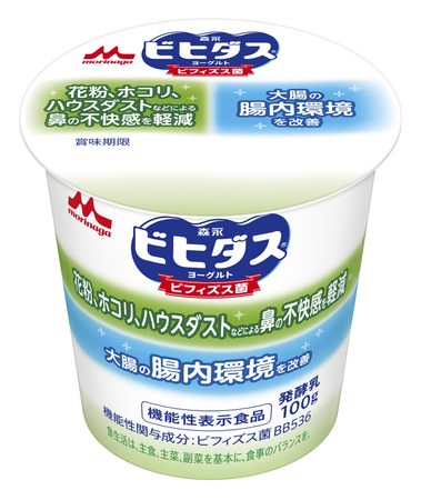 新商品「ビヒダスヨーグルトKF」は、「ビフィズス菌BB536」を関与成分とし、花粉、ホコリ、ハウスダストなどによる鼻の不快感を軽減することを謳った機能性表示食品です。毎日継続して食べていただけるよう、程よい甘さに仕上げています。ぜひお召し上がりください。
