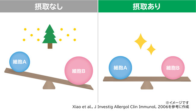過剰な反応がでます。ビフィズス菌 BB536の摂取により、細胞B(Th2細胞)を抑制するたんぱく質を増やし、
