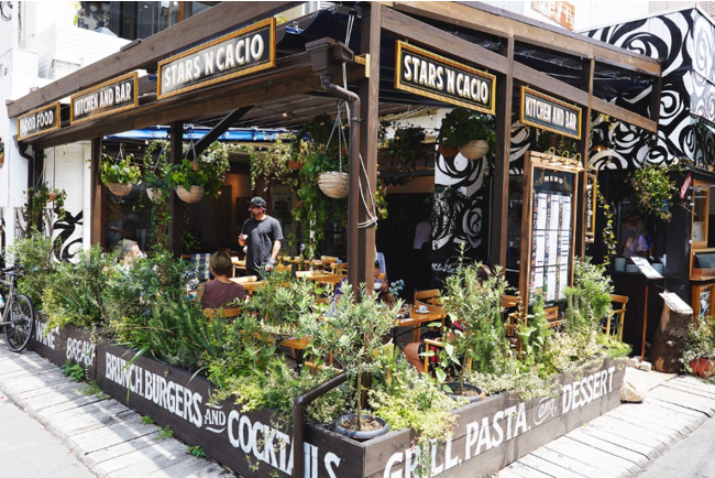 Stars’n Cacioを紹介する上で最もユニークなポイントは、伝統的文化とストリートをリンクさせていること。ツルが伸びるオープンテラスで食前酒を飲みながら、あるいは、著名なストリートアーティストUSUGROW氏によって手掛けられた、伝統的文化で有名な京都には珍しい、アンダーグラウンドな雰囲気の店内で、リラックスしたランチタイムを過ごせます。