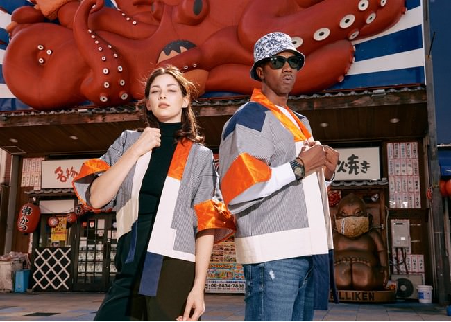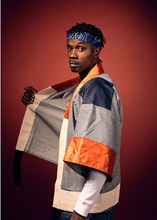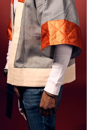 キルトコットンとジャパニーズデニムを合わせたStars’n Cacioの法被は、Stars’n Cacioのストリートラグジュアリーという理想を表現している限定品です。「私はStars’n Cacioの空間に合わせ、法被の色を選びました。だからデニム生地をポップなオレンジ色にしているのです。」
