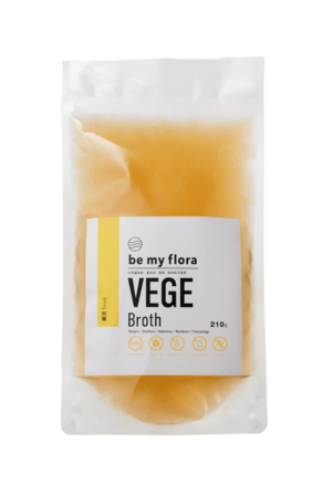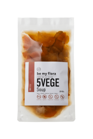 “人参・大根・里芋・蓮根・牛蒡”5つの野菜を栄養たっぷりの「be my floraベジブロス」で煮込んだ後、昆布・鰹節・煮干し・椎茸の出汁を加えたスープ。味付けは有機の金沢醤油と三河みりんのみ。出汁が香る飽きのこない和の味わいです。
