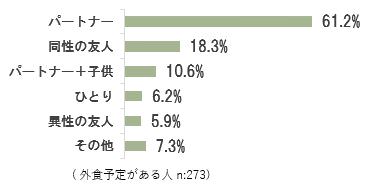A.「パートナー(配偶者・恋人等)」61.2%、「同性の友人」18.3%、「パートナー+子供」10.6%、「ひとり」6.2%、「異性の友人」5.9%、「その他」7.3%