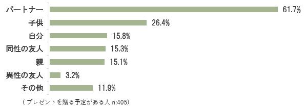 A.「パートナー(配偶者・恋人等)」61.7%、「子供」26.4%、「自分」15.8%、「同性の友人」15.3%、「親」15.1%、「異性の友人」3.2%、「その他」11.9%
