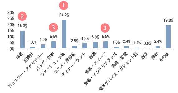 A.「ファッション小物」24.2%、「洋服」15.3%、「バッグ・財布」「食品・スイーツ」6.5%(上位3項目)