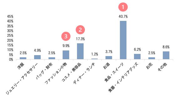 A.「食品・スイーツ」40.7%、「コスメ・美容品」17.3%、「ファッション小物」9.9%(上位3項目)