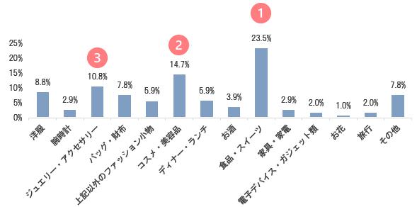 A.「食品・スイーツ」23.5%、「コスメ・美容品」14.7%、「ジュエリー・アクセサリー」10.8%(上位3項目)