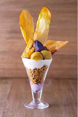 鹿児島を中心とした契約農家から直送のさつま芋たちは、一度焼き芋にしたものをペースト状にし、使用しております。カリっとした食感がうれしい金時芋棒やたっぷりのごまをまとった胡麻さつまも入れました。あっさりミルクと濃厚バニラの2種類のアイスとの相性も抜群です。グラスの底までお芋の美味しさを詰め込みました。