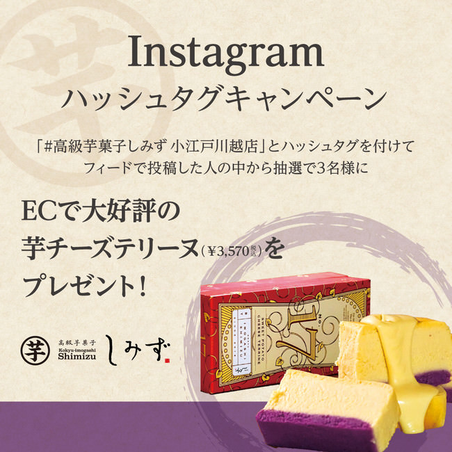 「#高級芋菓子しみず小江戸川越店」とフィードで投稿した方の中から抽選で3名様に、ECサイトと渋谷東急フードショー店、クリスタ長堀店、阪急三番街店のみ購入可能なレア感の高い、「高級芋菓子しみず」プロデュースの“お芋チーズテリーヌ”「shimizu No.17」を抽選で3名様にプレゼント。※当選報告は、DMでの案内を持ってかえさせていただきます。
