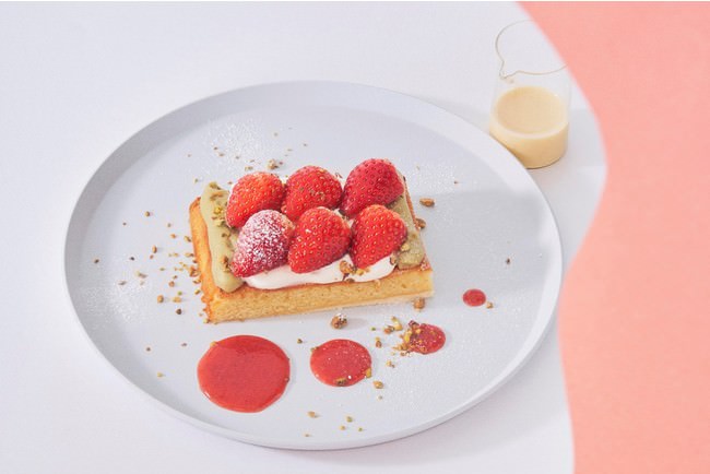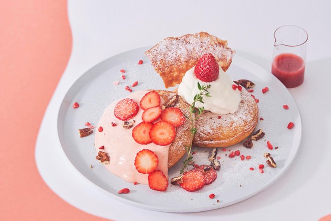 フレッシュな産地直送“あすかルビー”いちごの甘酸っぱさと濃厚なコンフィチュールの2つの「いちご」の味わいが楽しめるパンケーキ。仕上げのカルダモンパウダーでより一層さわやかに。