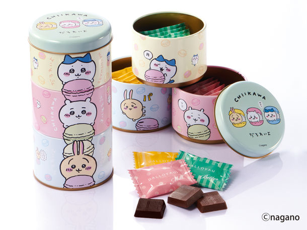 どこから見ても「ちいかわ」たちだらけ!缶を重ねると、マカロンを持った「ちいかわ」たちが並ぶ、アフターユース性の高いスタッキング缶にチョコレートを詰め合わせました。