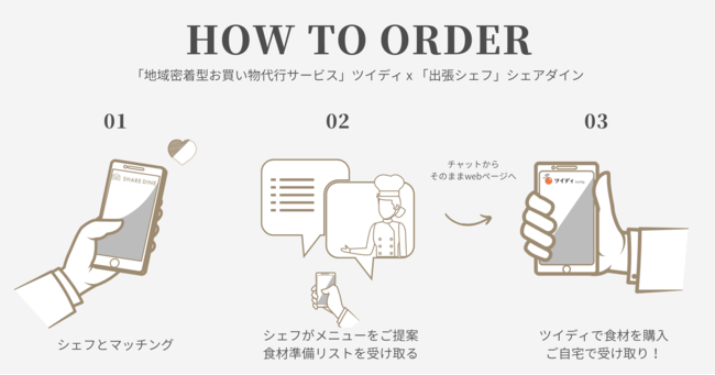 そこで、ご利用者様が、食材調達から料理の調理・提供まで一環してオンラインでオーダーを完結させることができ、ご自宅から一歩も出ることなく、おうち時間を楽しめる出張料理の体験を提供するべく、日本発の地域密着型お買い物代行サービスである「ツイディ」とサービス連携を開始いたします。