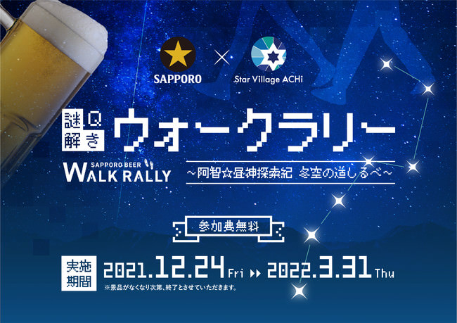 日本一の星空「長野県阿智村」の、株式会社阿智昼神観光局(代表取締役社長:白澤裕次)は、サッポロビール株式会社長野支社と共同で、2021年12月24日(金)より、昼神温泉内を巡って謎を解く、謎解きウォークラリー【阿智☆昼神探索紀 ~冬空の道しるべ~】をスタートいたします。