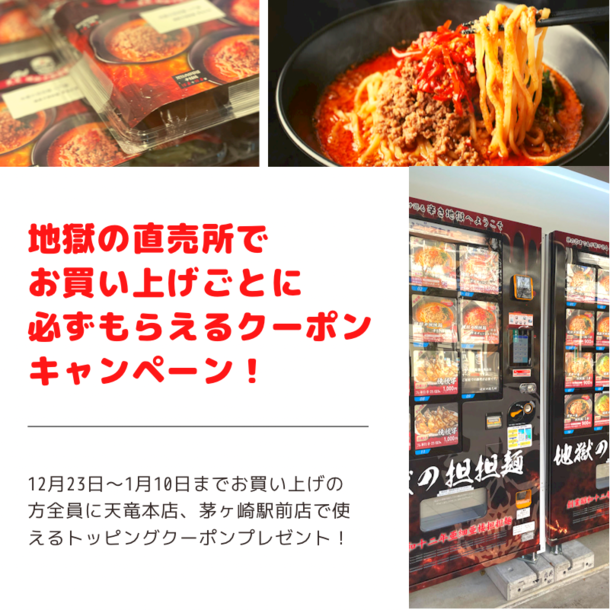 また、12月23日から1月10日の期間限定で、冷凍自動販売機からご購入いただいた地獄の担担麺に茅ヶ崎駅前店と本店で使えるクーポンをお付けいたします。
