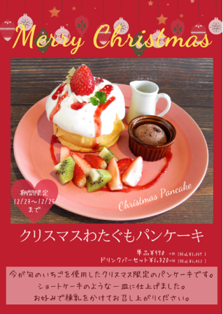 ㈱河京Cocco tree(本社:福島県喜多方市、代表取締役:佐藤富次郎)は、12/23~12/25の3日間限定でクリスマスパンケーキを販売いたします。