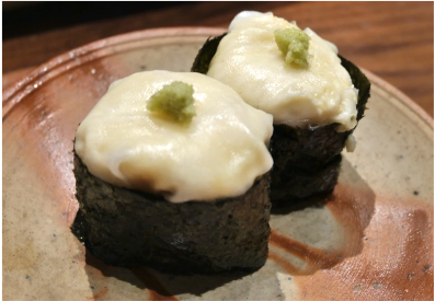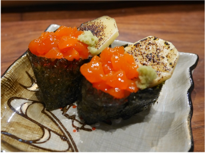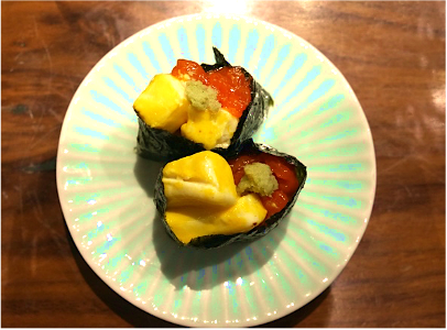 オレンジ色の味の濃い卵を醤油漬け。それをいくらに見えるように、小さくくりぬき軍艦の上に乗せました。いくらのプチプチ感はないけれど、とろける食感が美味しい!うに・いくら丼を食べている感じです。