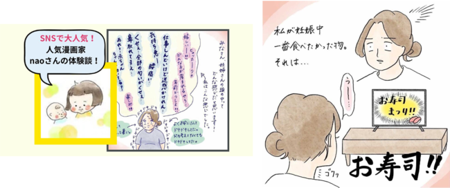 第一弾でも好評いただいた「妊婦あるある漫画」。ご自身も3歳の女の子と1歳の男の子を育てるママである漫画家のnaoさんが、妊娠中にやはり経験された「お寿司食べたい!」の衝動をコミカルな漫画にしてくれました。