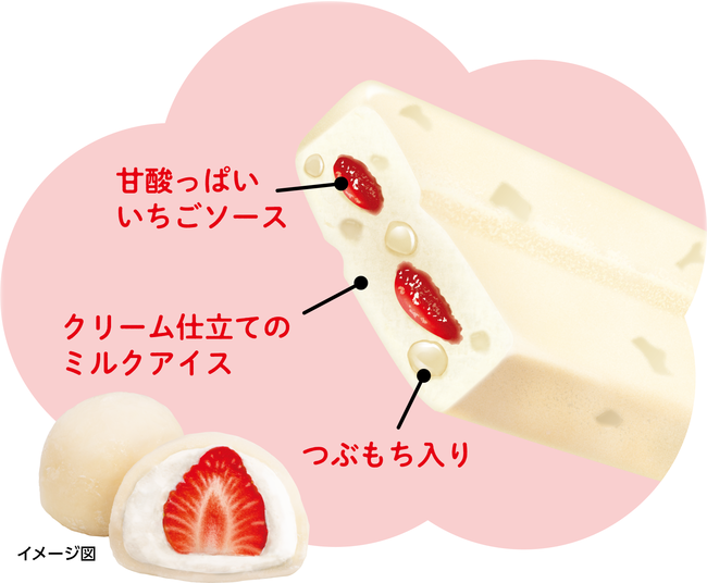 「いちごみるく大福バー」は、もっちりとした食感のミルクアイスにつぶ状の餅を混ぜ込み、さらにいちごソースを2本の柱状に充填したバーアイスです。
